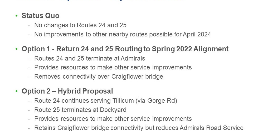 On Tuesday October 24th, 2023, BC Transit held a 90 minute meeting with the public to share options for the future of transit in the Gorge/Tillicum area.